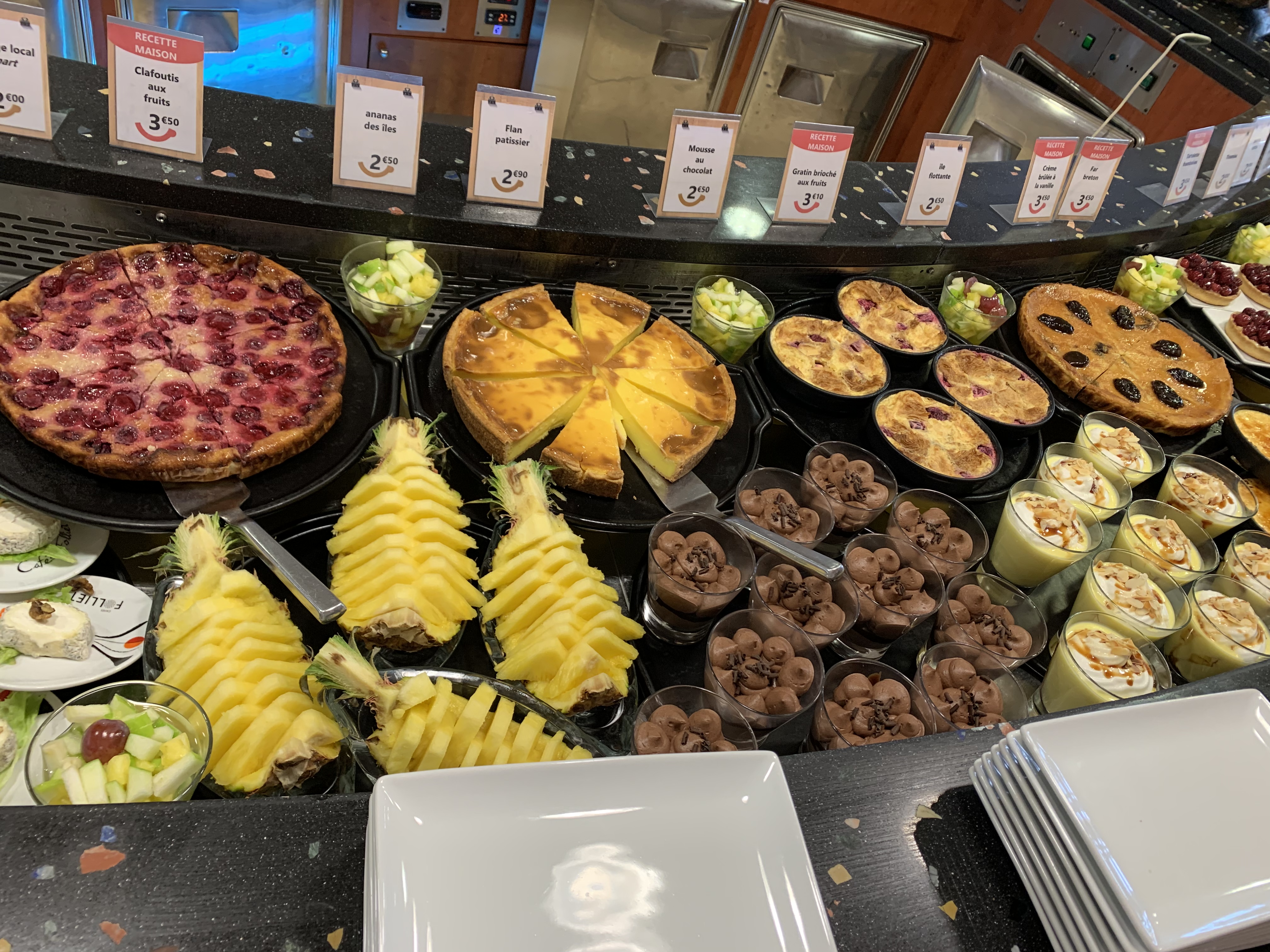 Cafétéria classique avec entrées et desserts variés plat chaud au menus du jour assiette basquaise ce jour là avec légumes à volonté